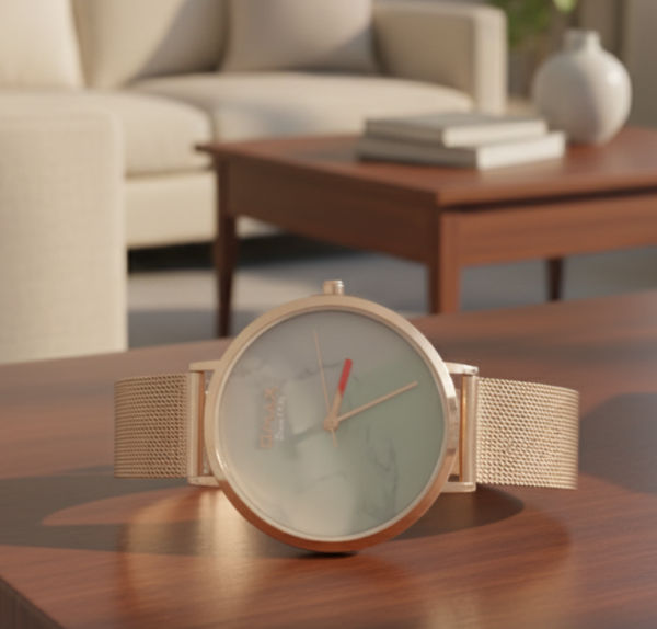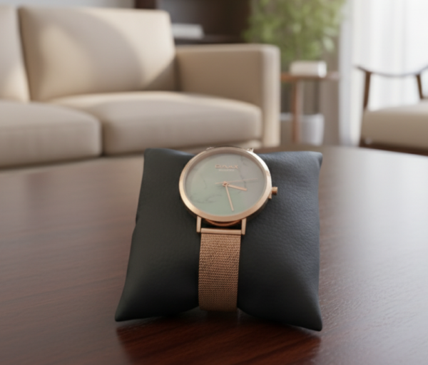 The strap is made of a fine metallic mesh in the same rose-gold color, giving the watch a lightweight and harmonious aesthetic. Overall, it is a timepiece that beautifully combines elegance and minimalism, making it suitable for both daily wear and special occasions.