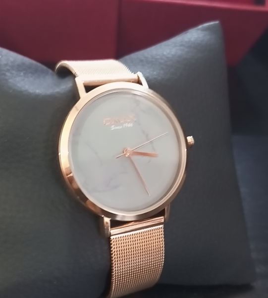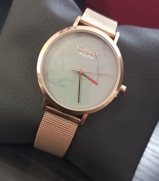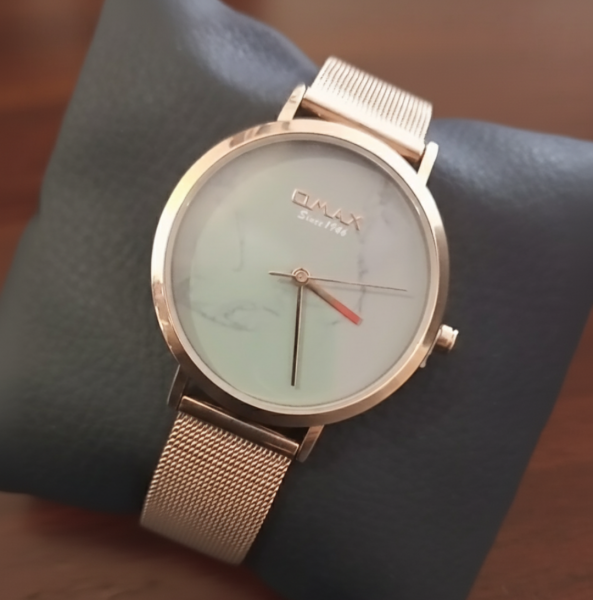 It features a round case in a polished rose-gold tone, giving the watch a feminine and luxurious appearance. The dial is simple and clean, with a light, marble-like background that adds a subtle touch of sophistication without being overwhelming.