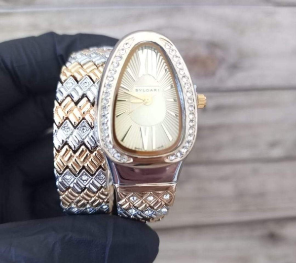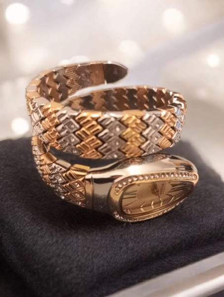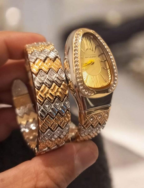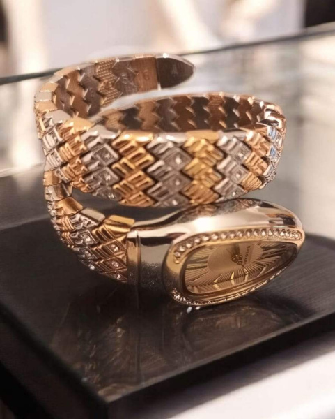 ساعة نسائية بتصميم راقٍ يجمع بين الذهبي والفضي، مرصّعة بتفاصيل فاخرة تلفت الأنظار من أول نظرة.