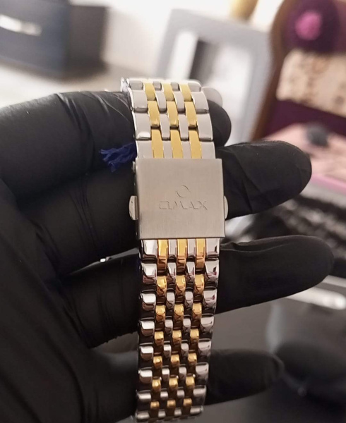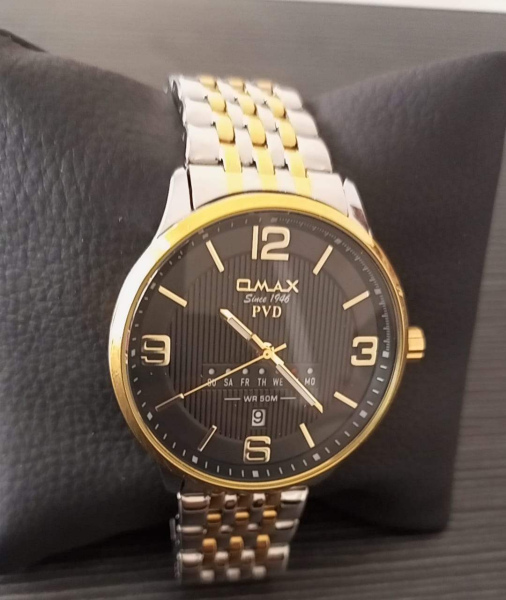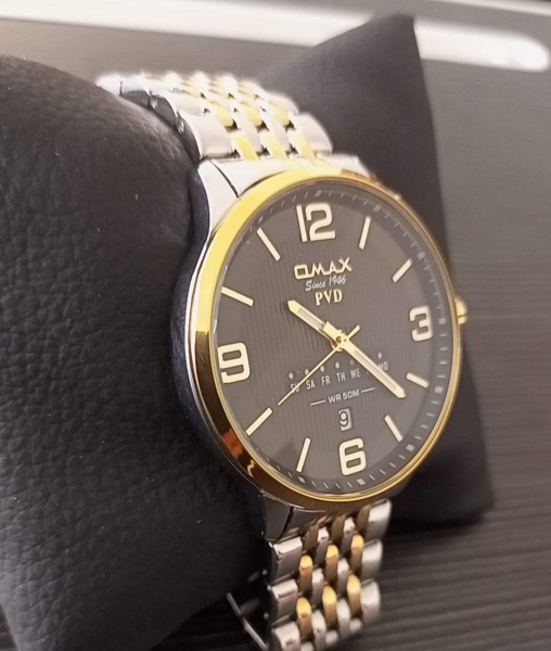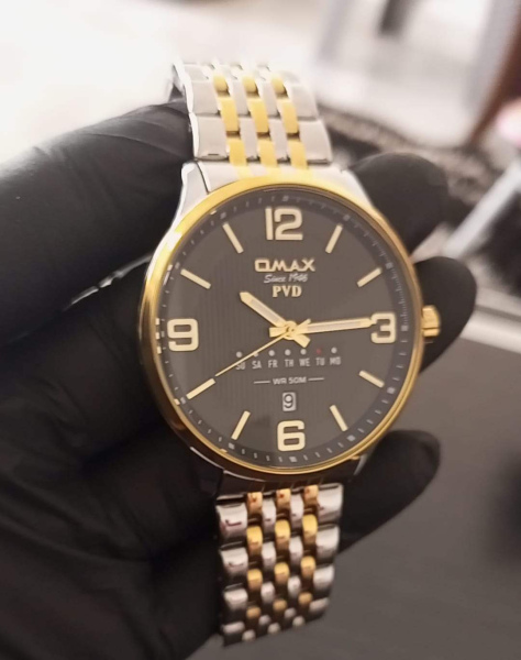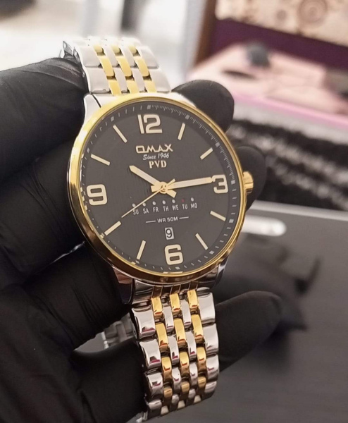 stylish watch from the brand "QMAX." The watch features a two-tone stainless steel bracelet in silver and gold, giving it an elegant and luxurious look. The dial is black with large, easy-to-read golden numbers. It also displays the day of the week and the date, along with a 50-meter water resistance (WR 50M) rating.